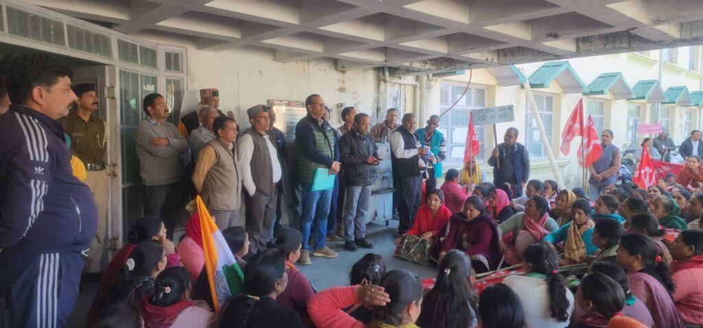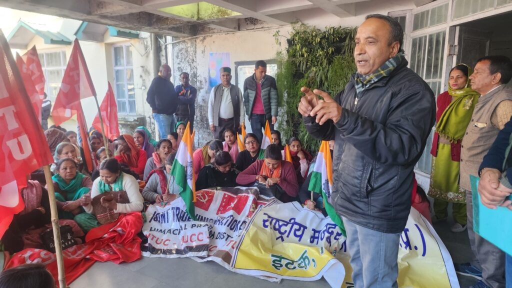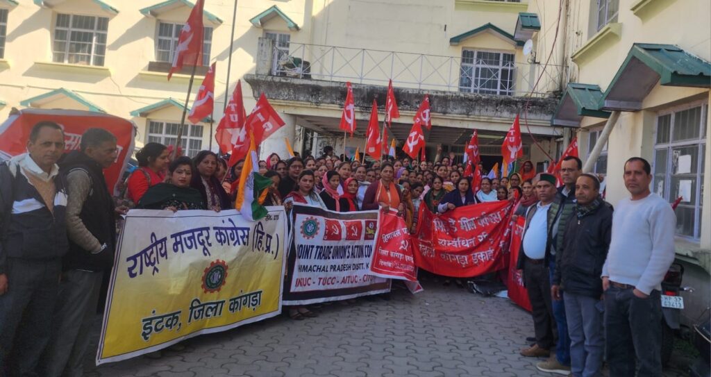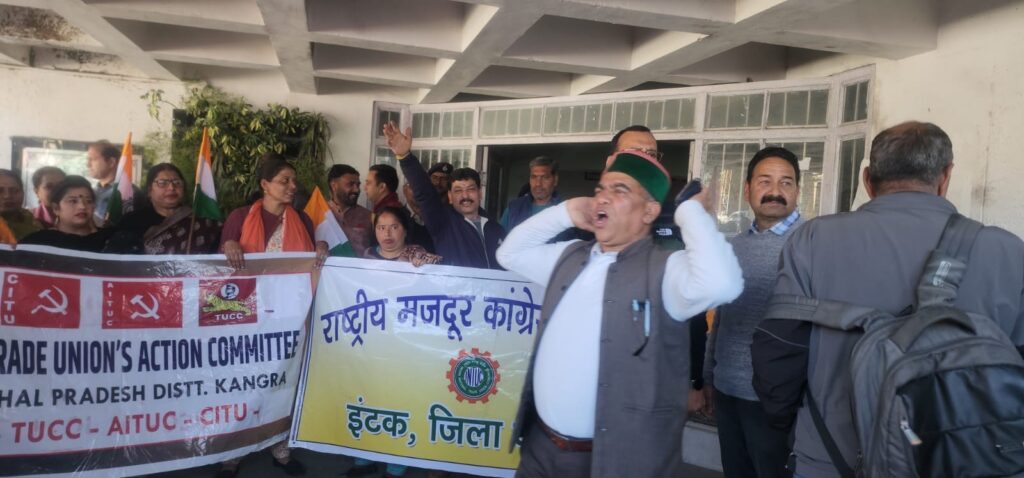 प्रदर्शन का नेतृत्व इंटक जिला कांगड़ा अध्यक्ष संजय सैनी एवं सीटू के जिला प्रधान केवल कुमार ने किया।